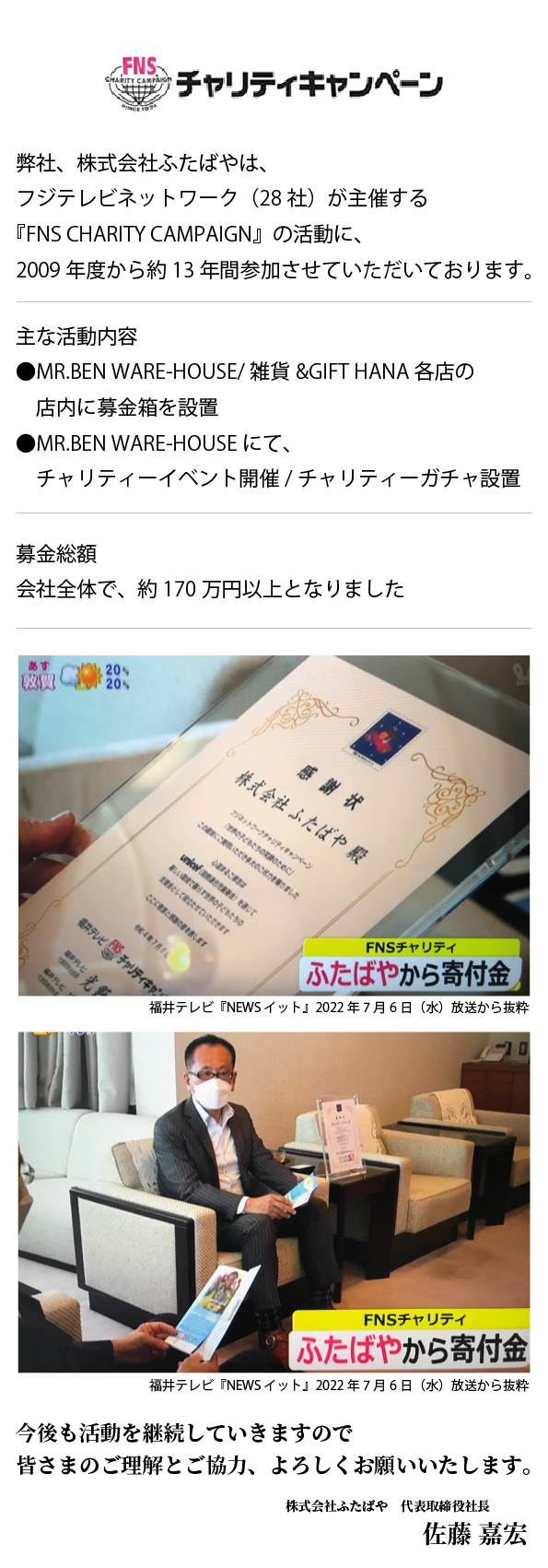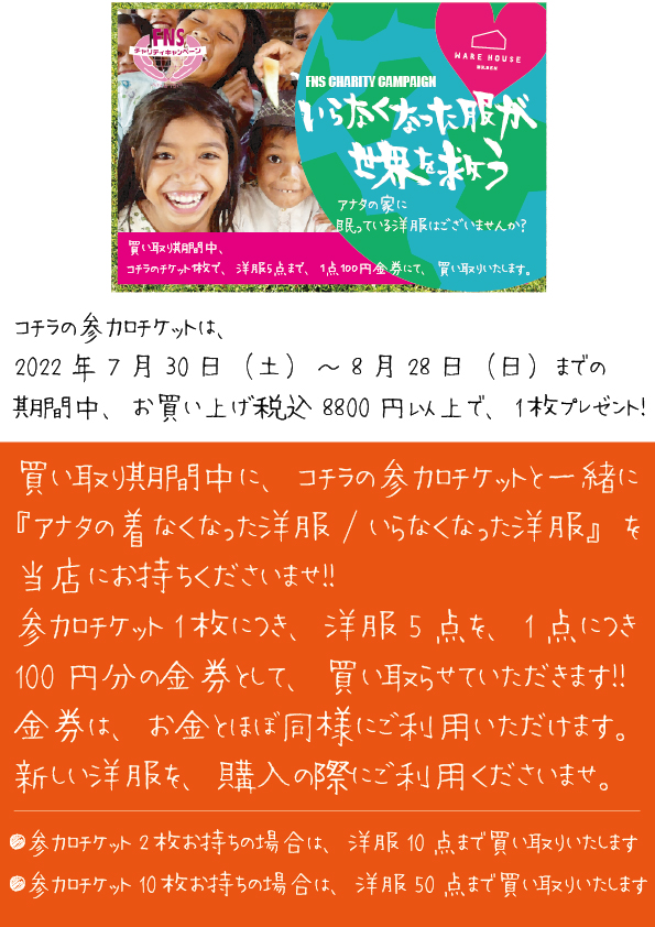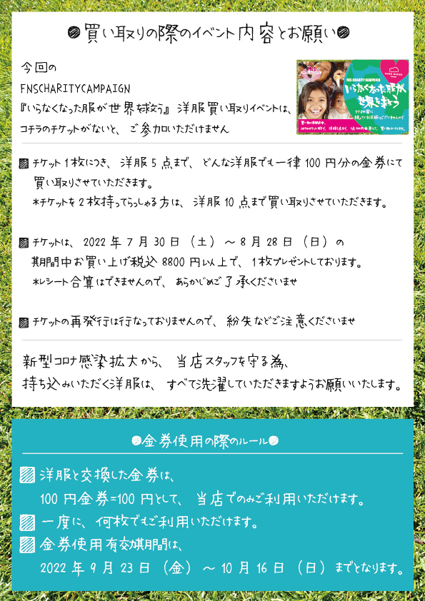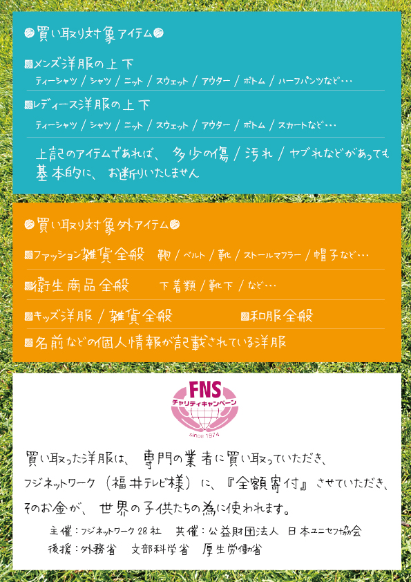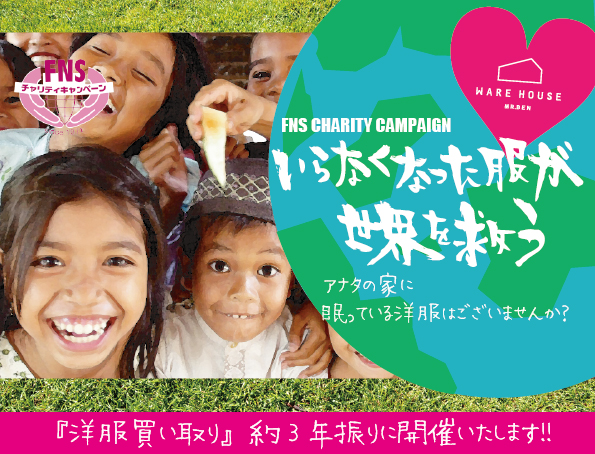 約3年振りに開催決定!!FNS CHARITYCAMPAIGN『いらなくなった服が世界を救う』洋服買い取りイベント開催!